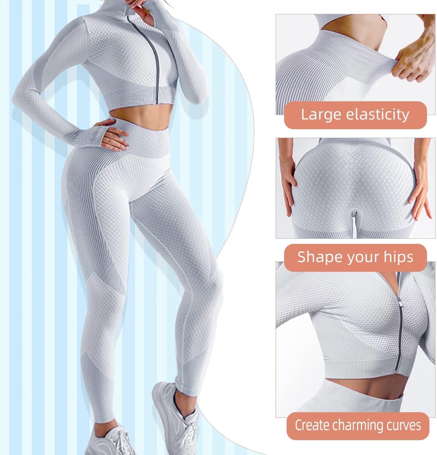 - Three ways to wear.* gym outfits-Stretch Sports Bra+Butt Lifting Leggings; * Workout Set-Long sleeve zip crop top+booty lifting leggings for women;* Tracksuit Set-Bra+crop top+legging. Professional Honeycomb Fabric For Sportwear, can meet the basic needs of exercises.