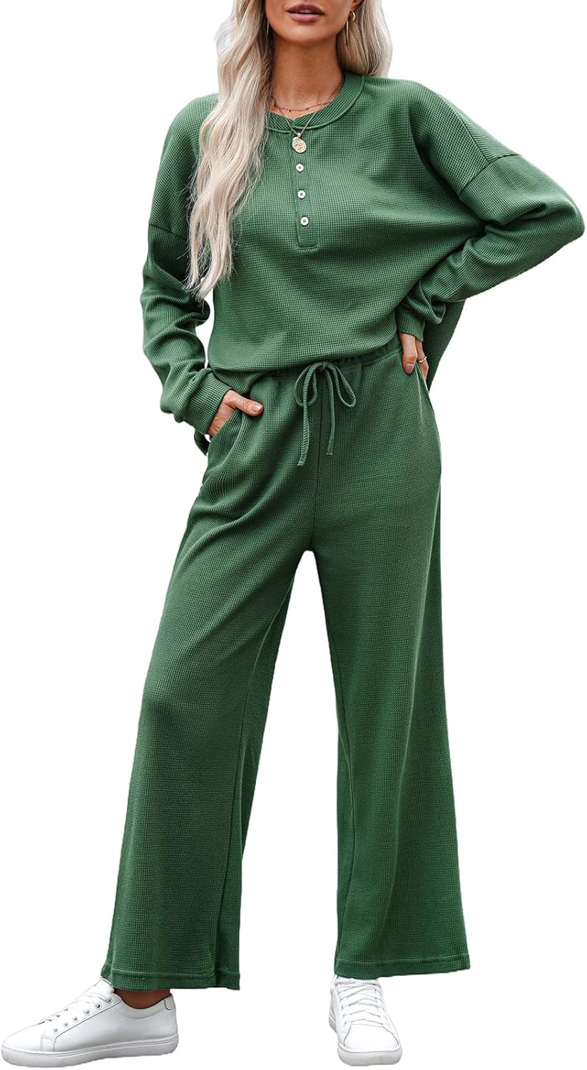- Design: Top: crew neck, button design, long sleeve, simple solid color, soft knitted textured, dropped raglan sleeves, pullover sweater top; Pants: Elastic waistband pants with adjustable drawstring, high-rise design, side patchwork, casual loose style, while the pockets on both sides offer convenient storage for small items. Women’s 2 piece lounger wear outfits sets not only trendy and relaxed but also offer freedom.